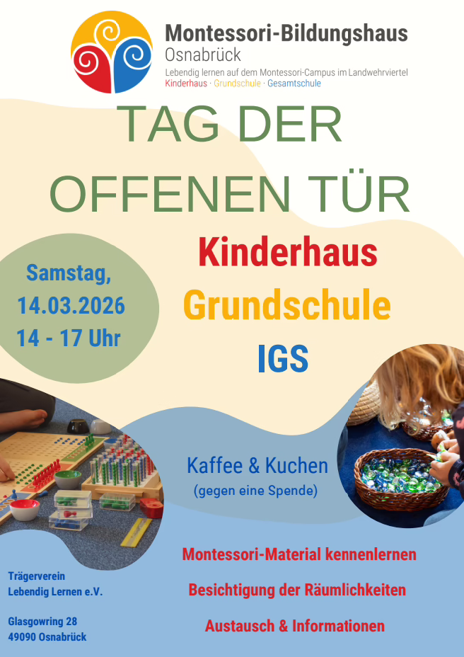 Save the date: Unser nächster Tag der offenen Tür (Kinderhaus, Grundschule, weiterführende Schule) ist am 14.03.2026 von 14:00 bis 17:00 Uhr.